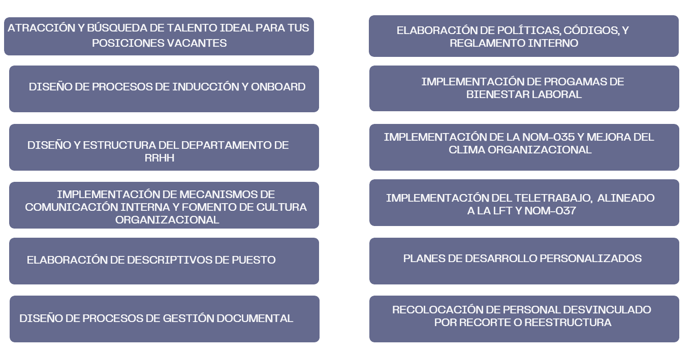 Soluciones Estratégicas en Capital Humano. Cultura organizacional, Clima Laboral, NOM-035, Diseño de Perfiles de Puesto, Reclutamiento y Selección, Diseño de Reglamento Interior, Proceso de Onboarding, Análisis de perfiles directivos, Offboarding y empleabilidad.